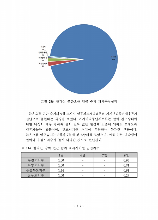 417 그림 286. 한라산 붉은오름 인근 습지 개체수구성비 붉은오름 인근 습지의 9월 조사시 민무늬조개벌레류와 가지머리풍년새우류가 집단으로 출현하는 특징을 보였다. 가지머리풍년새우류는 알이 건조상태에 대한 내성이 매우 강하여 물이 있다 없는 환경에 노출이 되어도 오래도록 생존가능한 생물이며, 건조시기를 거쳐야 부화하는 독특한 생물이다. 붉은오름 인근습지는 6월과 7월에 건조상태를 보였으며, 이로 인한 대발생이 일어나 우점도지수가 높게 나타난 것으로 판단된다. 4월 6월 7월 9월 우점도지수 1.00 0.96 다양도지수 1.00 0.74 종풍부도지수 1.44 0.91 균등도지수 1.00 0.29 표 114. 한라산 남벽 인근 습지 조사시기별군집지수