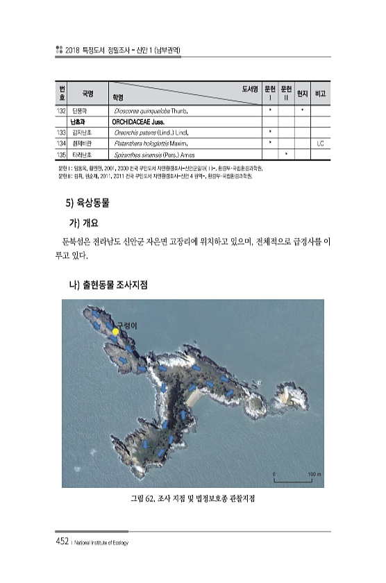 2018 특정도서 정밀조사 신안 1 남부권역 452 ? National Institute of Ecology 5 둔북섬은 전라남도 신안군 자은면 고장리에 위치하고 있으며, 전체적으로 급경사를 이 루고 있다. 그림 62. 조사 지점 및 법정보호종 관찰지점 번 호 국명 도서명 학명 문헌 Ⅰ 문헌 Ⅱ 현지 비고 132 단풍마 Dioscorea quinqueloba Thunb. * * 난초과 ORCHIDACEAE Juss. 133 감자난초 Oreorchis patens Lindl. Lindl. * 134 흰제비란 Platanthera hologlottis Maxim. * LC 135 타래난초 Spiranthes sinensis Pers. Ames * 문헌Ⅰ임동옥, 황인천. 2001. 2000 전국 무인도서 자연환경...