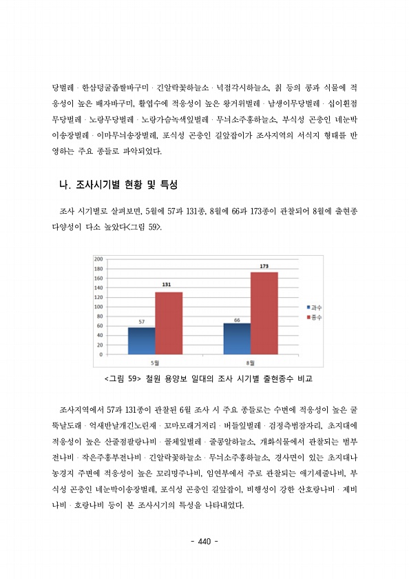 440 당벌레 한삼덩굴좁쌀바구미 긴알락꽃하늘소 넉점각시하늘소 칡 등의 콩과 식물에 적 ? ? ? , 응성이 높은 배자바구미 활엽수에 적응성이 높은 왕거위벌레 남생이무당벌레 십이흰점 , ? ? 무당벌레 노랑무당벌레 노랑가슴녹색잎벌레 무늬소주홍하늘소 부식성 곤충인 네눈박 ? ? ? , 이송장벌레 이마무늬송장벌레 포식성 곤충인 길앞잡이가 조사지역의 서식지 형태를 반 ? , 영하는 주요 종들로 파악되었다. 조사 시기별로 살펴보면 월에 과 종 월에 과 종이 관찰되어 월에 출현종 , 5 57 131 , 8 66 173 8 다양성이 다소 높았다 그림 59 그림 59 철원 용양보 일대의 조사 시기별 출현종수 비교 조사지역에서 과 종이 관찰된 월 조사 시 주요 종들로는 수변에 적응성이 높은 굴 57 131 6 뚝날도래 억새...