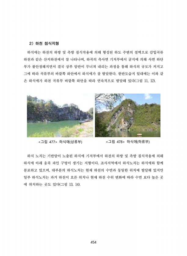 454 2 하천 침식지형 하식애는 하천의 하방 및 측방 침식작용에 의해 형성된 하도 주변의 절벽으로 감입곡류 하천과 같은 산지하천에서 잘 나타나며, 하곡의 측사면 기저부에서 굴식에 의해 사면 하단 부가 불안정해지면서 결국 상부 암반이 무너져 내리는 과정을 통해 하식의 규모가 커지고 그에 따라 곡류부의 바깥쪽 하안에서 하식애가 잘 발달한다. 한반도습지 일대에는 이와 같 은 하식애가 하천 곡류부 바깥쪽 하안을 따라 연속적으로 발달해 있다 그림 11, 12 그림 477 하식애 상류부 그림 478 하식애 하류부 하식 노치는 기반암이 노출된 하식애 기저부에서 하천의 하방 및 측방 침식작용에 의해 하식애 아래 움푹 파인 구멍이 생기는 지형이다. 조사지역에서 하식노치는 하식애와 함께 분포하고 있으며, 대부분의 하식노치는...
