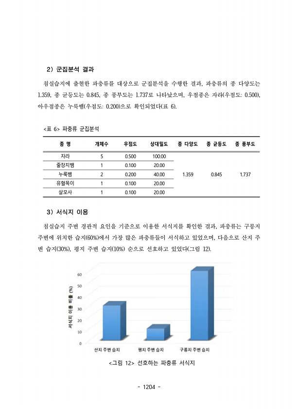 1204 2 군집분석 결과 침실습지에 출현한 파충류를 대상으로 군집분석을 수행한 결과, 파충류의 종 다양도는 1.359, 종 균등도는 0.845, 종 풍부도는 1.737로 나타났으며, 우점종은 자라 우점도0.500 , 아우점종은 누룩뱀 우점도0.200 으로 확인되었다 표 6 종 명 개체수 우점도 상대밀도 종 다양도 종 균등도 종 풍부도 자라 5 0.500 100.00 1.359 0.845 1.737 줄장지뱀 1 0.100 20.00 누룩뱀 2 0.200 40.00 유혈목이 1 0.100 20.00 살모사 1 0.100 20.00 표 6 파충류 군집분석 3 서식지 이용 침실습지 주변 경관적 요인을 기준으로 이용한 서식지를 확인한 결과, 파충류는 구릉지 주변에 위치한 습지 60% 에서 가장 많은 파충류들이 서식...