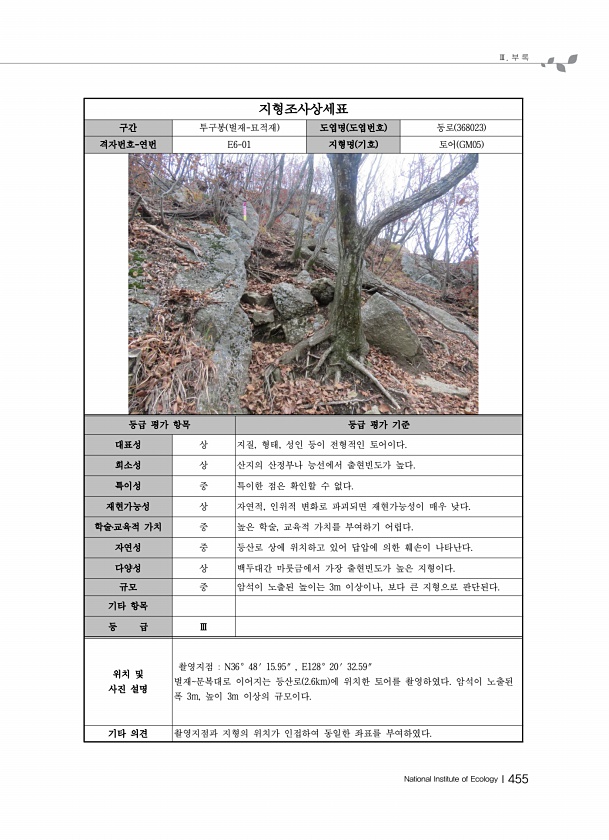 Ⅲ. 부 록 National Institute of EcologyⅠ455 지형조사상세표 구간 투구봉 벌재-묘적재 도엽명 도엽번호 동로 368023 격자번호-연번 E6-01 지형명 기호 토어 GM05 등급 평가 항목 등급 평가 기준 대표성 상 지질, 형태, 성인 등이 전형적인 토어이다. 희소성 상 산지의 산정부나 능선에서 출현빈도가 높다. 특이성 중 특이한 점은 확인할 수 없다. 재현가능성 상 자연적, 인위적 변화로 파괴되면 재현가능성이 매우 낮다. 학술?교육적 가치 중 높은 학술, 교육적 가치를 부여하기 어렵다. 자연성 중 등산로 상에 위치하고 있어 답압에 의한 훼손이 나타난다. 다양성 상 백두대간 마룻금에서 가장 출현빈도가 높은 지형이다. 규모 중 암석이 노출된 높이는 3m 이상이나, 보다 큰 지형으로 판...