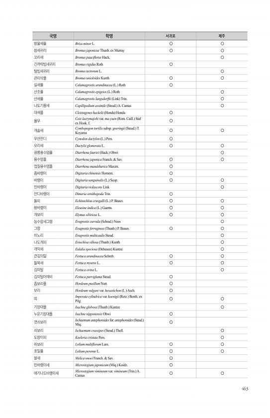 463 방울새풀 Briza minor L. ○ ○ 참새귀리 Bromus japonicus Thunb. ex Murray ○ ○ 꼬리새 Bromus pauciforus Hack. ○ 긴까락빕새귀리 Bromus rigidus Roth ○ 털빕새귀리 Bromus tectorum L. ○ 큰이삭풀 Bromus unioloides Kunth ○ ○ 실새풀 Calamagrostis arundinacea L. Roth ○ 산조풀 Calamagrostis epigeios L. Roth ○ 산새풀 Calamagrostis langsdorffi Link Trin. ○ 나도기름새 Capillipedium assimile Steud. A. Camus ○ 대새풀 Cleistogenes hackelii Honda Honda ○ 율무...