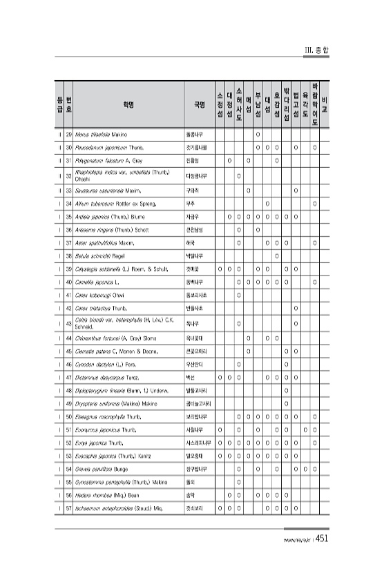 III. 종 합 www.nie.re.kr ?451 등 급 번 호 학명 국명 소 정 섬 대 정 섬 소 허 사 도 매 섬 부 남 섬 대 섬 호 감 섬 밖 다 리 섬 법 고 섬 육 각 도 바 람 막 이 도 비 고 Ⅱ 29 Morus tiliaefolia Makino 돌뽕나무 O Ⅱ 30 Peucedanum japonicum Thunb. 갯기름나물 O O O O O Ⅱ 31 Polygonatum falcatum A. Gray 진황정 O O O Ⅱ 32 Rhaphiolepis indica var. umbellata Thunb. Ohashi 다정큼나무 O Ⅱ 33 Saussurea ussuriensis Maxim. 구와취 O O Ⅰ 34 Allium tuberosum Rottler ex Spreng. 부추 O O Ⅰ ...