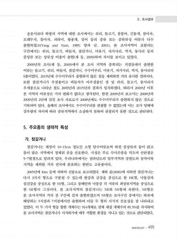 Ⅱ. 조사결과 www.nie.re.kr ? 455 운문사보다 하방의 지역에 대한 조사에서는 쉬리, 돌고기, 참붕어, 긴몰개, 참마자, 모래무지, 돌마자, 피라미, 왕종개, 밀어 등의 중류 또는 중하류성 어류가 다수 출현하였고 Yang and Nam, 1985; 양과 금, 2001 , 본 조사지역이 포함되는 구간에서는 쉬리, 돌고기, 버들치, 참갈겨니, 미유기, 자가사리, 꺽지, 동사리 등의 중상류 또는 상류성 어종이 출현 채 등, 2009 하여 차이를 보이고 있었다. 2009년의 조사 채 등, 2009 에서 본 조사 지역과 중복되는 지점들에서 출현한 어류는 돌고기, 쉬리, 버들치, 참갈겨니, 수수미꾸리, 미유기, 자가사리, 꺽지, 동사리의 9종이었다. 2015년에 수수미꾸리가 출현하지 않은 점을 제외하면 거...