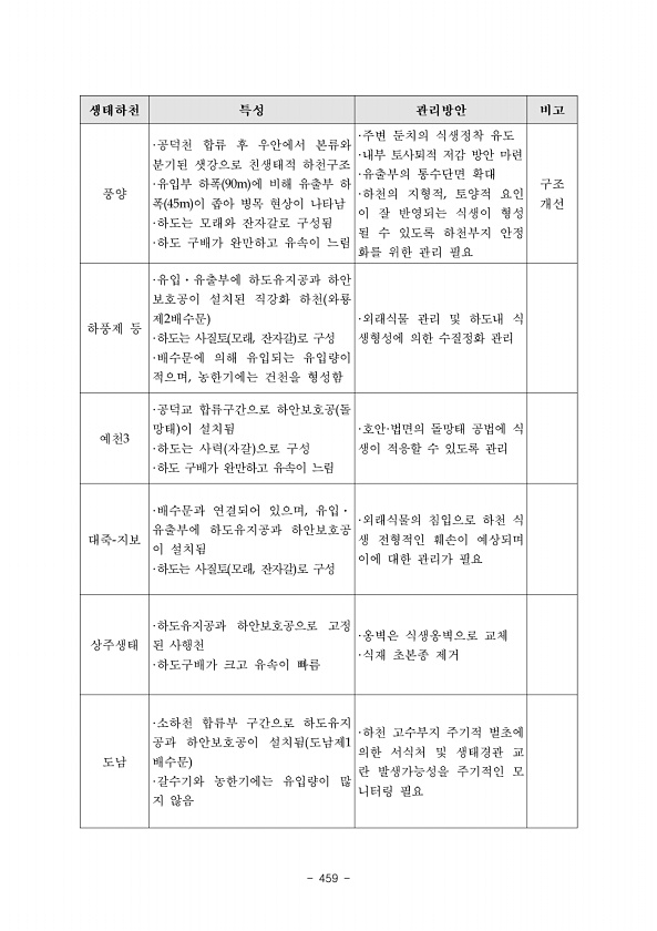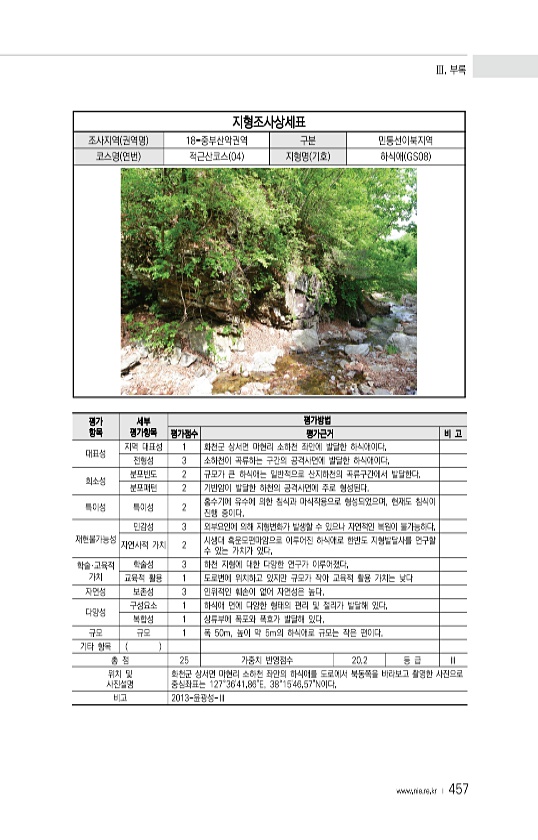 Ⅲ. 부록 www.nie.re.kr ? 457 지형조사상세표 조사지역 권역명 18-중부산악권역 구분 민통선이북지역 코스명 연번 적근산코스 04 지형명 기호 하식애 GS08 평가 항목 세부 평가항목 평가방법 평가점수 평가근거 비 고 대표성 지역 대표성 1 화천군 상서면 마현리 소하천 좌안에 발달한 하식애이다. 전형성 3 소하천이 곡류하는 구간의 공격사면에 발달한 하식애이다. 희소성 분포빈도 2 규모가 큰 하식애는 일반적으로 산지하천의 곡류구간에서 발달한다. 분포패턴 2 기반암이 발달한 하천의 공격사면에 주로 형성된다. 특이성 특이성 2 홍수기에 유수에 의한 침식과 마식작용으로 형성되었으며, 현재도 침식이 진행 중이다. 재현불가능성 민감성 3 외부요인에 의해 지형변화가 발생할 수 있으나 자연적인 복원이 불가능하...