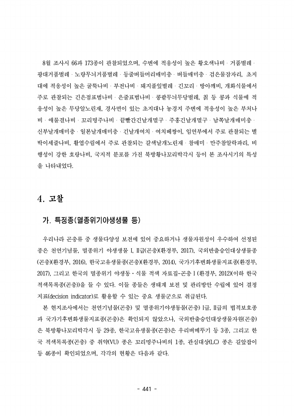 441 8 66 173 월 조사시 과 종이 관찰되었으며 수변에 적응성이 높은 황오색나비 거품벌레 , ? ? 광대거품벌레 노랑무늬거품벌레 등줄버들머리매미충 버들매미충 검은물잠자리 초지, ? ? ? ? 대에 적응성이 높은 굴뚝나비 부전나비 돼지풀잎벌레 긴꼬리 방아깨비 개화식물에서 ? ? ? ? , 주로 관찰되는 긴은점표범나비 은줄표범나비 콩팥무늬무당벌레 칡 등 콩과 식물에 적 ? ? , 응성이 높은 무당알노린재 경사면이 있는 초지대나 농경지 주변에 적응성이 높은 부처나 , 비 애물결나비 꼬리명주나비 끝빨간긴날개멸구 주홍긴날개멸구 남쪽날개매미충 ? ? ? ? ? ? 신부날개매미충 일본날개매미충 긴날개여치 여치베짱이 임연부에서 주로 관찰되는 별 ? ? ? , 박이세줄나비 활엽수림에서 주로 관찰되는 갈색날개노린재 참...