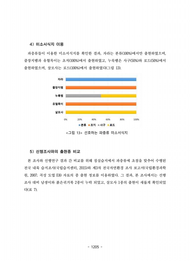 1205 4 미소서식지 이용 파충류들이 이용한 미소서식지를 확인한 결과, 자라는 본류 100% 에서만 출현하였으며, 줄장지뱀과 유혈목이는 초지 100% 에서 출현하였고, 누룩뱀은 사구 50% 와 로드 50% 에서 출현하였으며, 살모사는 로드 100% 에서 출현하였다 그림 13 그림 13 선호하는 파충류 미소서식지 5 선행조사와의 출현종 비교 본 조사와 선행연구 결과 간 비교를 위해 침실습지에서 파충류에 초점을 맞추어 수행된 전국 내륙 습지조사 국립습지센터, 2015 와 제3차 전국자연환경 조사 보고서 국립환경과학 원, 2007; 곡성 도엽 E8 자료의 종 출현 정보를 이용하였다. 그 결과, 본 조사에서는 선행 조사 대비 남생이와 붉은귀거북 2종이 누락 되었고, 살모사 1종의 출현이 새롭게 확인되었 다 표 7