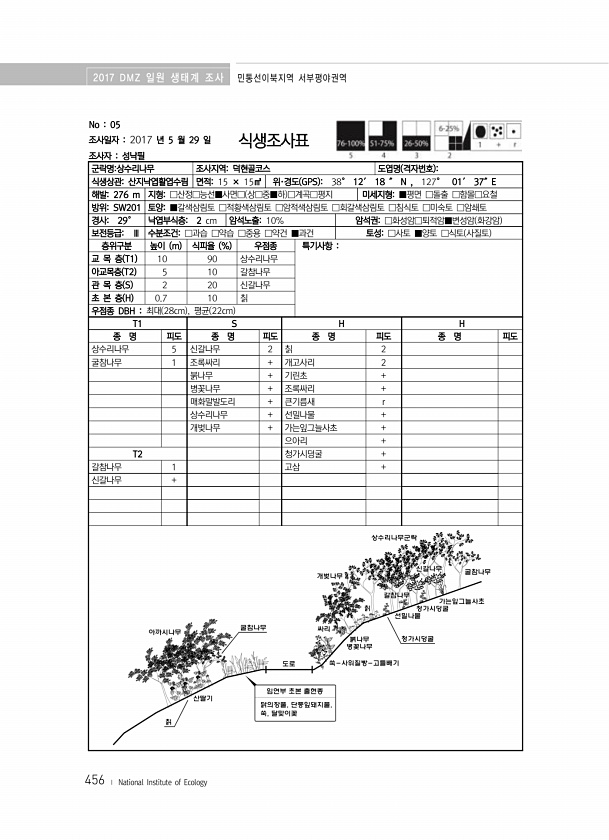 2017 DMZ 일원 생태계 조사 민통선이북지역 서부평야권역 456 ? National Institute of Ecology No 05 조사일자 2017 년 5 월 29 일 조사자 성낙필 식생조사표 군락명상수리나무 조사지역덕현골코스 도엽명 격자번호 식생상관산지낙엽활엽수림 면적15 × 15㎡ 위·경도 GPS 38° 12′ 18 ″ N , 127° 01′ 37″E 해발276 m 지형□산정□능선■사면□ 상□중■하 □계곡□평지 미세지형■평면 □돌출 □함몰□요철 방위SW201 토양■갈색삼림토 □적황색삼림토 □암적색삼림토 □회갈색삼림토 □침식토 □미숙토 □암쇄토 경사29° 낙엽부식층2 cm 암석노출10% 암석권□화성암□퇴적암■변성암 화강암 보전등급Ⅲ 수분조건□과습 □약습 □중용 □약건 ■과건 토성□사토 ■양토 □식토 ...