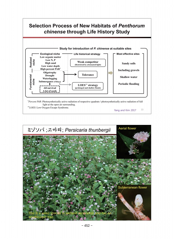 ミゾソバ ;고마리; Persicaria thunbergii This is a weed species in wetland restoration and has an amphicarpic trait. Aerial flower Subterranean flower 34 Selection Process of New Habitats of Penthorum chinense through Life History Study Realized niche Fundamental niche Study for introduction of P. chinense at suitable sites Ecological niche Most effective sites Oligotrophy Drought Waterlogging Submergence...
