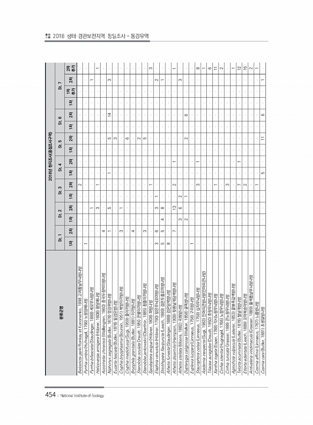 454 분류군명 2018년 현지조사 중점조사구역 St. 1 St. 2 St. 3 St. 4 St. 5 St. 6 St. 7 1차 2차 1차 2차 1차 2차 1차 2차 1차 2차 1차 2차 1차 1차 추가 2차 추가 2차 Belosticta parki Ronkay et Kononenko, 1998 고려톱날무늬밤나방 2 Pyrrhia umbra Hufnagel, 1766 노랑담배나방 1 Pyrrhia bifasciata Staudinger, 1888 세모무늬밤나방 1 1 Helicoverpa armigera H?bner, 1808 왕담배나방 3 ...
