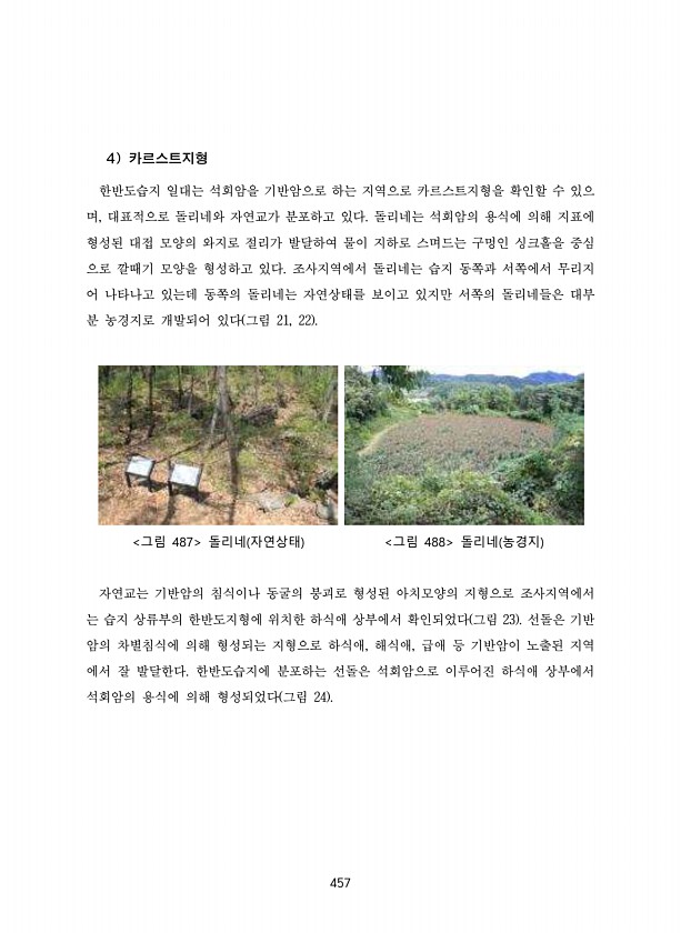 457 4 카르스트지형 한반도습지 일대는 석회암을 기반암으로 하는 지역으로 카르스트지형을 확인할 수 있으 며, 대표적으로 돌리네와 자연교가 분포하고 있다. 돌리네는 석회암의 용식에 의해 지표에 형성된 대접 모양의 와지로 절리가 발달하여 물이 지하로 스며드는 구멍인 싱크홀을 중심 으로 깔때기 모양을 형성하고 있다. 조사지역에서 돌리네는 습지 동쪽과 서쪽에서 무리지 어 나타나고 있는데 동쪽의 돌리네는 자연상태를 보이고 있지만 서쪽의 돌리네들은 대부 분 농경지로 개발되어 있다 그림 21, 22 그림 487 돌리네 자연상태 그림 488 돌리네 농경지 자연교는 기반암의 침식이나 동굴의 붕괴로 형성된 아치모양의 지형으로 조사지역에서 는 습지 상류부의 한반도지형에 위치한 하식애 상부에서 확인되었다 그림 23 선돌은 기반...