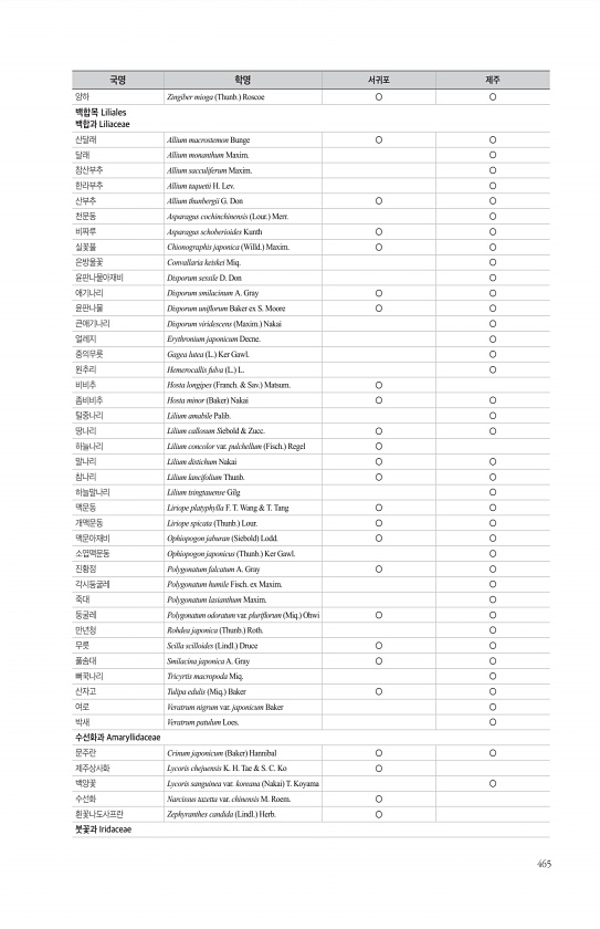 465 양하 Zingiber mioga Thunb. Roscoe ○ ○ 백합목 Liliales 백합과 Liliaceae 산달래 Allium macrostemon Bunge ○ ○ 달래 Allium monanthum Maxim. ○ 참산부추 Allium sacculiferum Maxim. ○ 한라부추 Allium taquetii H. Lev. ○ 산부추 Allium thunbergii G. Don ○ ○ 천문동 Asparagus cochinchinensis Lour. Merr. ○ 비짜루 Asparagus schoberioides Kunth ○ ○ 실꽃풀 Chionographis japonica Willd. Maxim. ○ ○ 은방울꽃 Convallaria keiskei Miq. ○ 윤판나물아재비 Dispor...