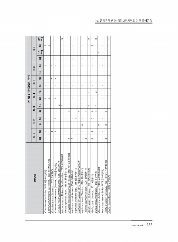 455 분류군명 2018년 현지조사 중점조사구역 St. 1 St. 2 St. 3 St. 4 St. 5 St. 6 St. 7 1차 2차 1차 2차 1차 2차 1차 2차 1차 2차 1차 2차 1차 1차 추가 2차 추가 2차 Cosmia achatina Butler, 1879 제주꼬마밤나방 3 4 2 Cosmia camptostigma M?n?tri?s, 1859 회색쌍줄밤나방 2 3 Cosmia trapezina Linnaeus, 1758 한국밤나방 1 7 8 Chasminodes albonitens Bremer, 1861 은빛밤나방 2 3 2 5 ...