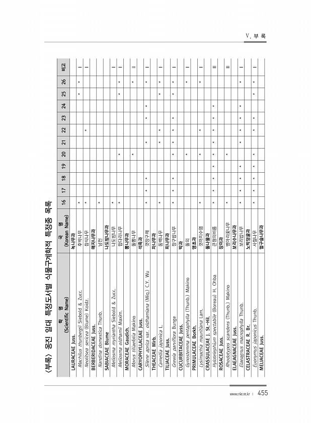 455 학 명 Scientific Name 국 명 Korean Name 16 17 18 19 20 21 22 23 24 25 26 비고 LAURACEAE Juss. 녹나무과 Machilus thunbergii Siebold & Zucc. 후박나무 * * * Ⅰ Neolitsea sericea Blume Koidz. 참식나무 * * Ⅰ BERBERIDACEAE Juss. 매자나무과 Nandina domestica Thunb. 남천 * SABIACEAE Blume 나도밤나무과 Meliosma myriantha Siebold & Zucc. 나도밤나무 * Ⅰ Meliosma oldhamii Maxim. 합다리나무 * * * * Ⅰ MORACEAE Gaudich. 뽕나무과 Morus tiliaefolia Makino...