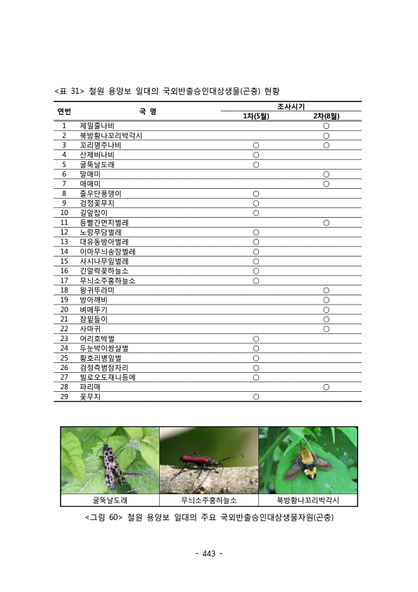 443 연번 국 명 조사시기 1 5 차 월 2 8 차 월 1 제일줄나비 ○ 2 북방황나꼬리박각시 ○ 3 꼬리명주나비 ○ ○ 4 산제비나비 ○ 5 굴뚝날도래 ○ 6 말매미 ○ 7 애매미 ○ 8 줄우단풍뎅이 ○ 9 검정꽃무지 ○ 10 길앞잡이 ○ 11 등빨간먼지벌레 ○ 12 노랑무당벌레 ○ 13 대유동방아벌레 ○ 14 이마무늬송장벌레 ○ 15 사시나무잎벌레 ○ 16 긴알락꽃하늘소 ○ 17 무늬소주홍하늘소 ○ 18 왕귀뚜라미 ○ 19 방아깨비 ○ 20 벼메뚜기 ○ 21 참밑들이 ○ 22 사마귀 ○ 23 어리호박벌 ○ 24 두눈박이쌍살벌 ○ 25 황호리병잎벌 ○ 26 검정측범잠자리 ○ 27 빌로오도재니등에 ○ 28 파리매 ○ 29 꽃무지 ○ 표 31 철원 용양보 일대의 국외반출승인대상생물 곤충 현황 굴뚝날도래 무늬...