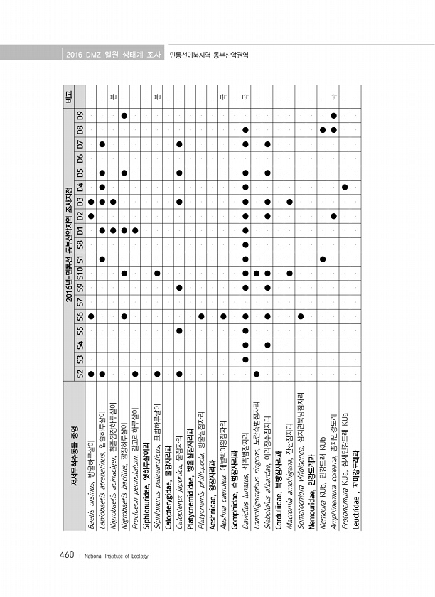460 저서무척추동물 종명 2016년-민통선 동부산악지역 조사지점 비고 S2 S3 S4 S5 S6 S7 S9 S10 S1 S8 D1 D2 D3 D4 D5 D6 D7 D8 D9 Baetis ursinus, 방울하루살이 ● ● ● ● Labiobaetis atrebatinus, 입술하루살이 ● ● ● ● ● ● ● Nigrobaetis acinaciger, 흰줄깜장하루살이 ● ● 분 Nigrobaetis bacillus, 깜장하루살이 ● ● ● ● ● Procloeon pennulatum, 갈고리...