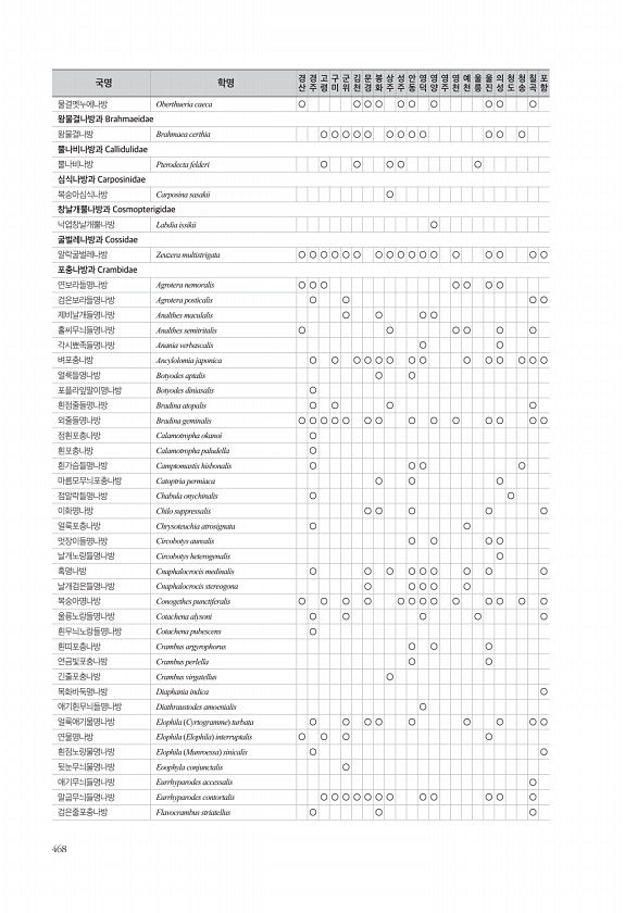 468 물결멧누에나방 Oberthueria caeca ○ ○ ○ ○ ○ ○ ○ ○ ○ ○ 왕물결나방과 Brahmaeidae 왕물결나방 Brahmaea certhia ○ ○ ○ ○ ○ ○ ○ ○ ○ ○ ○ ○ 뿔나비나방과 Callidulidae 뿔나비나방 Pterodecta felderi ○ ○ ○ ○ ○ 심식나방과 Carposinidae 복숭아심식나방 Carposina sasakii ○ 창날개뿔나방과 Cosmopterigidae 낙엽창날개뿔나방 Labdia issikii ○ 굴벌레나방과 Cossidae 알락굴벌레나방 Zeuzera multistrigata ○ ○ ○ ○ ○ ○ ○ ○ ○ ○ ○ ○ ○ ○ ○ ○ ○ 포충나방과 Crambidae 연보라들명나방 Agrotera nemoralis ○ ○ ○ ○ ○...