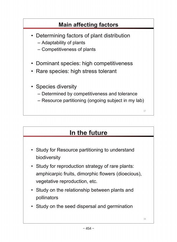 In the future ? Study for Resource partitioning to understand biodiversity ? Study for reproduction strategy of rare plantsamphicarpic fruits, dimorphic flowers dioecious , vegetative reproduction, etc. ? Study on the relationship between plants and pollinators ? Study on the seed dispersal and germination 38 Main affecting factors ? Determining factors of plant distribution ? Adaptability of plan...