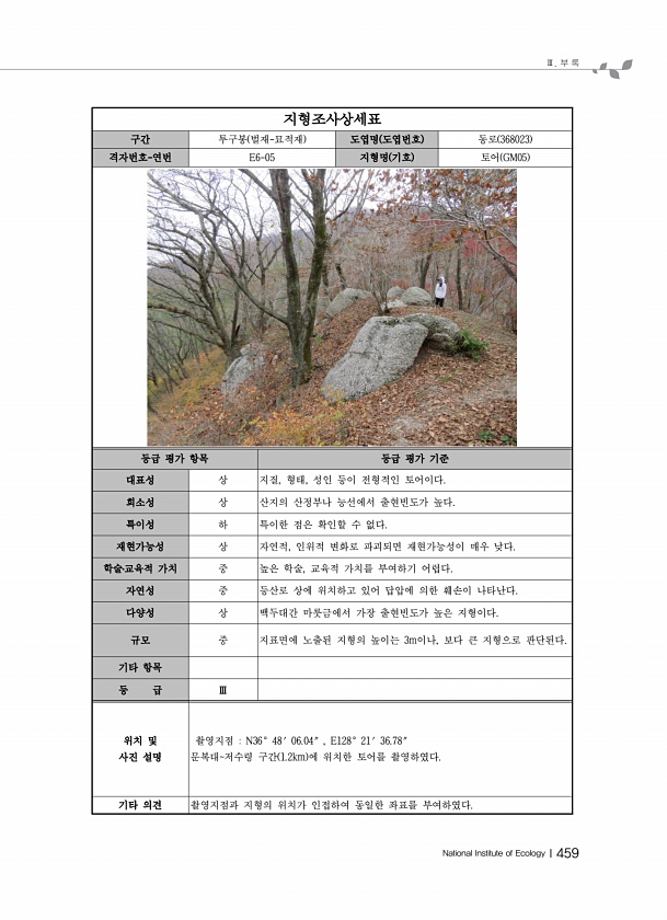 Ⅲ. 부 록 National Institute of EcologyⅠ459 지형조사상세표 구간 투구봉 벌재-묘적재 도엽명 도엽번호 동로 368023 격자번호-연번 E6-05 지형명 기호 토어 GM05 등급 평가 항목 등급 평가 기준 대표성 상 지질, 형태, 성인 등이 전형적인 토어이다. 희소성 상 산지의 산정부나 능선에서 출현빈도가 높다. 특이성 하 특이한 점은 확인할 수 없다. 재현가능성 상 자연적, 인위적 변화로 파괴되면 재현가능성이 매우 낮다. 학술?교육적 가치 중 높은 학술, 교육적 가치를 부여하기 어렵다. 자연성 중 등산로 상에 위치하고 있어 답압에 의한 훼손이 나타난다. 다양성 상 백두대간 마룻금에서 가장 출현빈도가 높은 지형이다. 규모 중 지표면에 노출된 지형의 높이는 3m이나, 보다 큰 지형으로...
