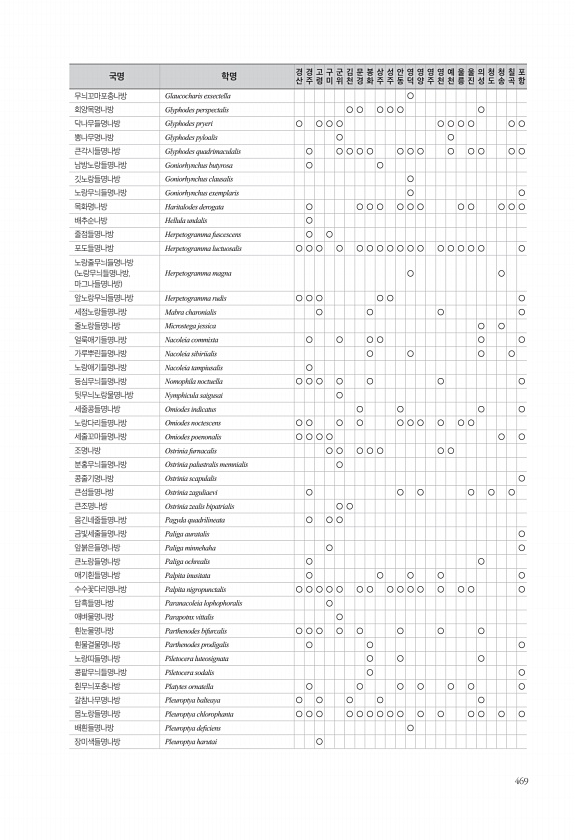 469 무늬꼬마포충나방 Glaucocharis exsectella ○ 회양목명나방 Glyphodes perspectalis ○ ○ ○ ○ ○ ○ 닥나무들명나방 Glyphodes pryeri ○ ○ ○ ○ ○ ○ ○ ○ ○ ○ 뽕나무명나방 Glyphodes pyloalis ○ ○ 큰각시들명나방 Glyphodes quadrimaculalis ○ ○ ○ ○ ○ ○ ○ ○ ○ ○ ○ ○ ○ 남방노랑들명나방 Goniorhynchus butyrosa ○ ○ 깃노랑들명나방 Goniorhynchus clausalis ○ 노랑무늬들명나방 Goniorhynchus exemplaris ○ ○ 목화명나방 Haritalodes derogata ○ ○ ○ ○ ○ ○ ○ ○ ○ ○ ○ ○ 배추순나방 Hellula undalis ○ 줄...