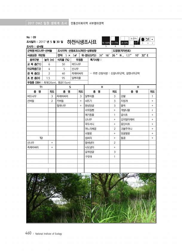 2017 DMZ 일원 생태계 조사 민통선이북지역 서부평야권역 460 ? National Institute of Ecology No 09 조사일자 2017 년 5 월 30 일 조사자 성낙필 하천식생조사표 군락명버드나무-선버들 조사지역산명호코스 좌안 -상류방향 도엽명 격자번호 식생상관하반림 면적5 × 5㎡ 위·경도 GPS 38° 16′ 26 ″ N , 127° 10′ 32″E 층위구분 높이 m 식피율 % 우점종 특기사항 교 목 층 T1 6 50 버드나무 주변 산림식생 신갈나무군락, 갈참나무군락 아교목층 T2 4 5 신나무 관 목 층 S 2 40 족제비싸리 초 본 층 H 1.5 95 달뿌리풀 우점종 DBH 최대 20cm , 평균 15cm T1 S H H 종 명 피도 종 명 피도 종 명 피도 종 명 피도 버드나무 ...