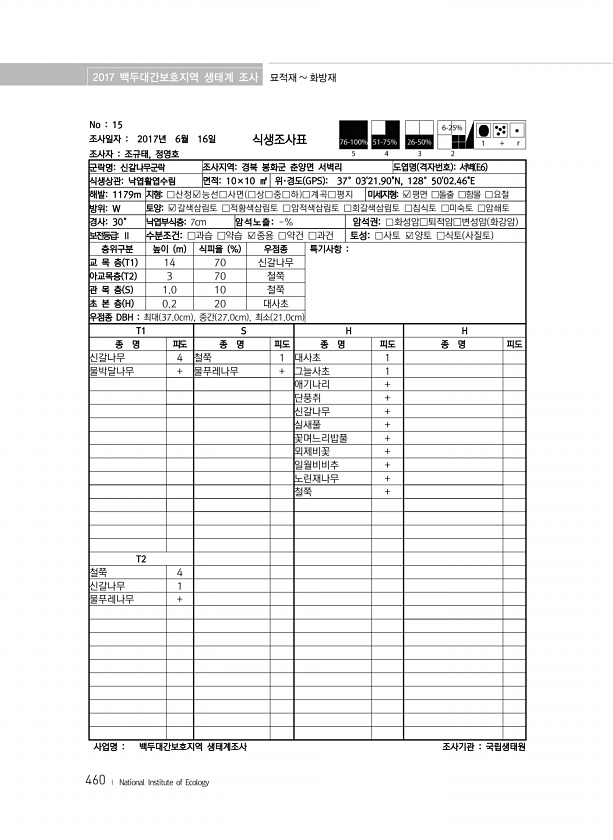 2017 백두대간보호지역 생태계 조사 묘적재 화방재 460 ? National Institute of Ecology No 15 조사일자 2017년 6월 16일 조사자 조규태, 정영호 식생조사표 군락명신갈나무군락 조사지역경북 봉화군 춘양면 서벽리 도엽명 격자번호 서벽 E6 식생상관낙엽활엽수림 면적10×10 ㎡ 위·경도 GPS 37°0321.90N, 128°5002.46E 해발1179m 지형□산정?능선□사면 □상□중□하 □계곡□평지 미세지형?평면 □돌출 □함몰 □요철 방위W 토양?갈색삼림토 □적황색삼림토 □암적색삼림토 □회갈색삼림토 □침식토 □미숙토 □암쇄토 경사30° 낙엽부식층7cm 암석노출-% 암석권□화성암□퇴적암□변성암 화강암 보전등급Ⅱ 수분조건□과습 □약습 ?중용 □약건 □과건 토성□사토 ?양토 □식토 ...