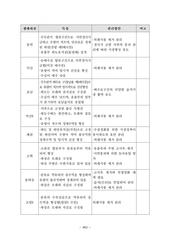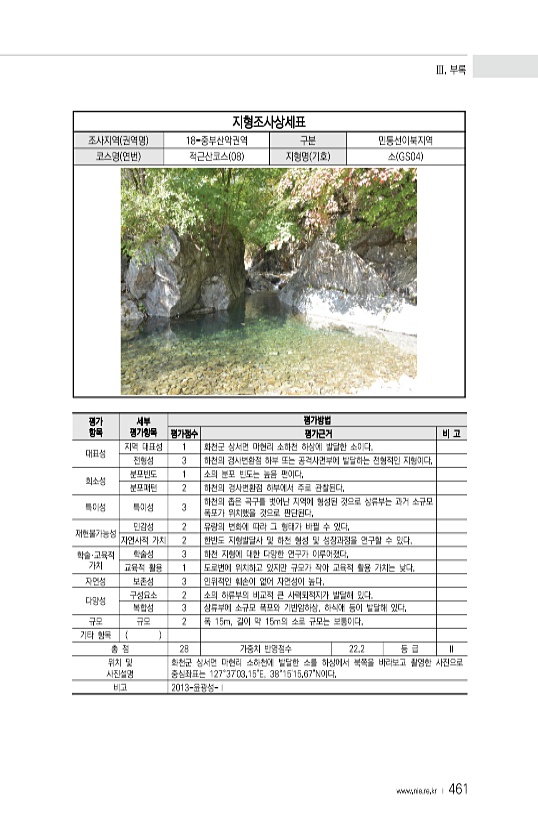 Ⅲ. 부록 www.nie.re.kr ? 461 지형조사상세표 조사지역 권역명 18-중부산악권역 구분 민통선이북지역 코스명 연번 적근산코스 08 지형명 기호 소 GS04 평가 항목 세부 평가항목 평가방법 평가점수 평가근거 비 고 대표성 지역 대표성 1 화천군 상서면 마현리 소하천 하상에 발달한 소이다. 전형성 3 하천의 경사변환점 하부 또는 공격사면부에 발달하는 전형적인 지형이다. 희소성 분포빈도 1 소의 분포 빈도는 높음 편이다. 분포패턴 2 하천의 경사변환점 하부에서 주로 관찰된다. 특이성 특이성 3 하천의 좁은 곡구를 벗어난 지역에 형성된 것으로 상류부는 과거 소규모 폭포가 위치했을 것으로 판단된다. 재현불가능성 민감성 2 유량의 변화에 따라 그 형태가 바뀔 수 있다. 자연사적 가치 2 한반도 지형발달사...