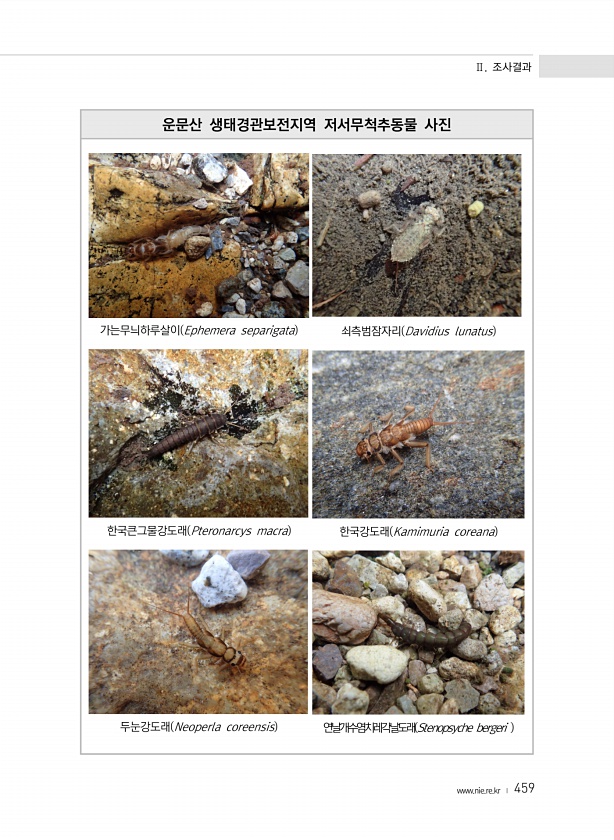 Ⅱ. 조사결과 www.nie.re.kr ? 459 운문산 생태경관보전지역 저서무척추동물 사진 가는무늬하루살이 Ephemera separigata 쇠측범잠자리 Davidius lunatus 한국큰그물강도래 Pteronarcys macra 한국강도래 Kamimuria coreana 두눈강도래 Neoperla coreensis 연날개수염치레각날도래 Stenopsyche bergeri