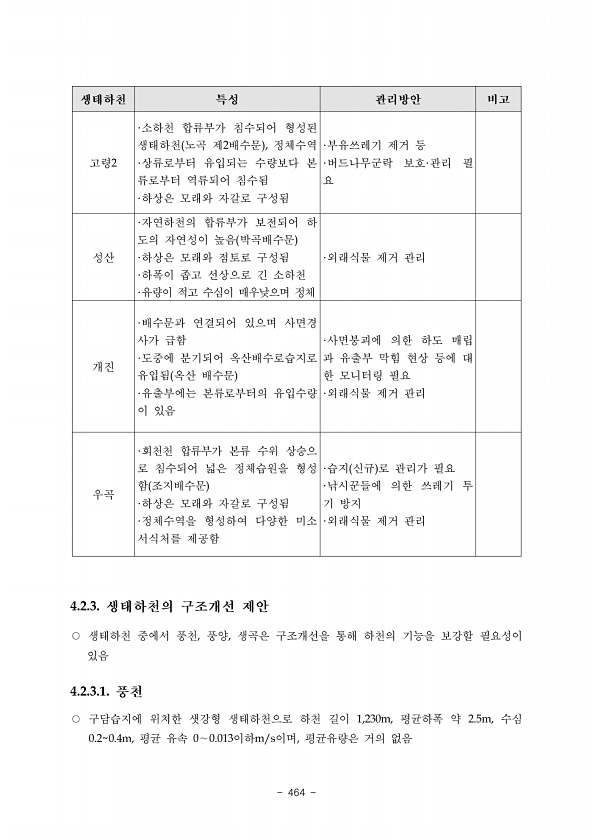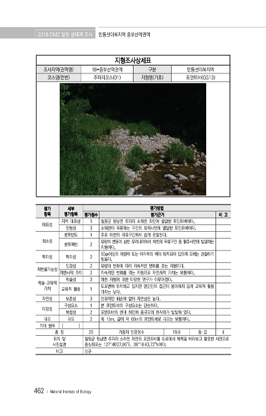 2018 DMZ 일원 생태계 조사 민통선이북지역 중부산악권역 462 ? National Institute of Ecology 지형조사상세표 조사지역 권역명 18-중부산악권역 구분 민통선이북지역 코스명 연번 주파리코스 01 지형명 기호 포인트바 GS13 평가 항목 세부 평가항목 평가방법 평가점수 평가근거 비 고 대표성 지역 대표성 1 철원군 원남면 주파리 소하천 좌안에 발달한 포인트바이다. 전형성 3 소하천이 곡류하는 구간의 퇴적사면에 발달한 포인트바이다. 희소성 분포빈도 1 주로 하천의 곡류구간에서 쉽게 관찰된다. 분포패턴 2 유량의 변동이 심한 우리나라에서 하천의 곡류구간 중 활주사면에 발달하는 지형이다. 특이성 특이성 2 10㎝이상의 아원력 또는 아각력의 력이 퇴적되어 있으며 모래는 관찰하기 힘들다. 재...