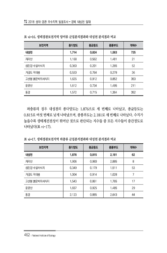 2018 생태·경관 우수지역 발굴조사 경북 내성천 일대 462 ? National Institute of Ecology 보전지역 종다양도 종균등도 종풍부도 개체수 내성천 1.714 0.824 1.063 725 지리산 1.168 0.562 1.481 21 섬진강 수달서식지 0.360 0.201 1.265 52 거금도 적대봉 0.530 0.764 0.279 36 고산봉 붉은박쥐서식지 1.635 0.912 0.852 353 운문산 1.612 0.734 1.495 211 동강 1.572 0.715 1.364 352 표 ⅵ-16. 생태경관보전지역 양서류 군집분석결과와 내성천 분석결과 비교 파충류의 경우 내성천의 종다양도는 1.876으로 세 번째로 나타났고, 종균등도는 0.815로 여섯 번째로 낮게 나타났으며, 종풍부...