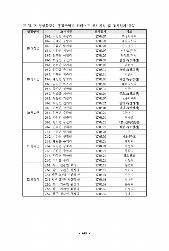 표 Ⅵ- 2. 경상북도의 행정구역별 외래어류 조사지점 및 조사일자 계속 행정구역 조사지점 조사일자 비고 18.의성군 18-1. 구천면 조성리 17.09.07 조성저수지 18-2. 안계면 봉양리 17.09.20 개천저수지 18-3. 가음면 양지리 17.09.20 양지저수지 18-4. 비안면 서부리 17.09.07 비안교 위천 18-5. 단북면 이연리 17.04.20 단밀교 위천 18-6. 보양면 구산리 17.04.20 탑산교 쌍계천 19.청도군 19-1. 운문면 순지리 ‘17.06.01 운문호 19-2. 화양읍 송북리 ‘17.05.31 소라교 청도천 19-3. 각북면 지슬리 ‘17.05.31 지슬지 19-4. 매전면 당호리 ‘17.06.01 매전교 동창천 19-5. 금천면 박곡리 ‘17.06.01 대비저수지 ...
