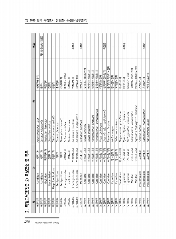 458 목 과 종 비고 메뚜기목 Acrididae 메뚜기과 Atractomorpha lata 섬서구메뚜기 메뚜기목 Acrididae 메뚜기과 Locusta migratoria 풀무치 국외반출승인대상종 메뚜기목 Gryllidae 귀뚜라미과 Metioche japonica 먹종다리 메뚜기목 Oecanthidae 긴꼬리과 Oecanthus indicus 긴꼬리 메뚜기목 Rhaphidophoridae 꼽등이과 Diestrammena apicalis 꼽등이 메뚜기목 Tettigoniidae 여치과 Ducetia japonica 줄베짱이 메뚜기목 Tettigoniidae 여치과 Metrioptera bonneti 잔날개여치 잠자리목 Coenagrionidae 실잠자리과 Ischnura asiatic...