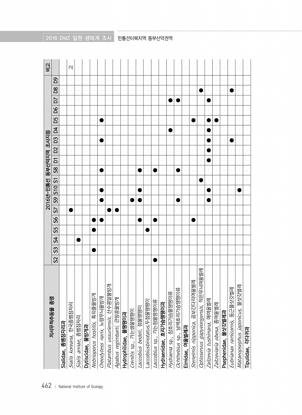 462 저서무척추동물 종명 2016년-민통선 동부산악지역 조사지점 비고 S2 S3 S4 S5 S6 S7 S9 S10 S1 S8 D1 D2 D3 D4 D5 D6 D7 D8 D9 Sialidae, 좀뱀잠자리과 Sialis koreana, 한국좀뱀잠자리 ● 고 Sialis annae, 좀뱀잠자리 ● Dytiscidae, 물방개과 Nebrioporus hostilis, 혹외줄물방개 ● ● ● Oreodytess narix, 노랑무늬물방개 ● ● ● ● ● ● Platambus...