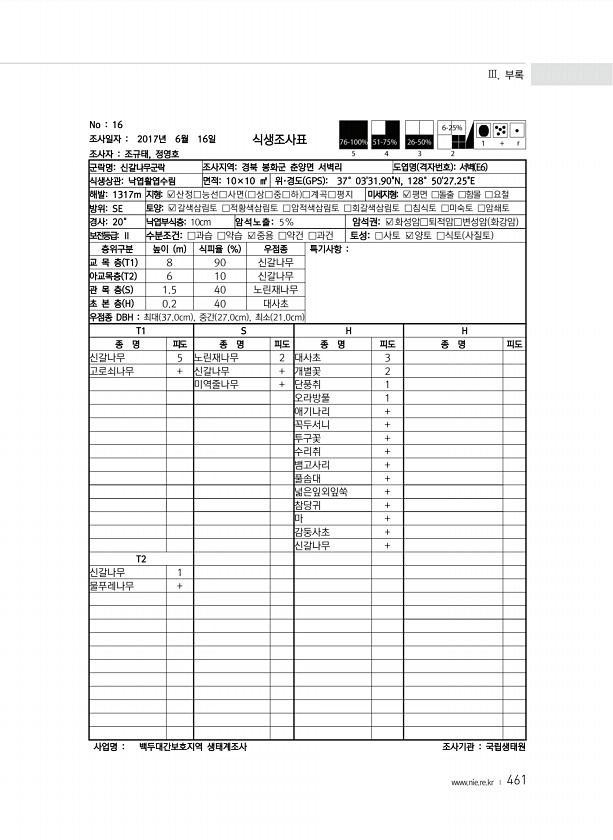 Ⅲ. 부록 www.nie.re.kr ? 461 No 16 조사일자 2017년 6월 16일 조사자 조규태, 정영호 식생조사표 군락명신갈나무군락 조사지역경북 봉화군 춘양면 서벽리 도엽명 격자번호 서벽 E6 식생상관낙엽활엽수림 면적10×10 ㎡ 위·경도 GPS 37°0331.90N, 128°5027.25E 해발1317m 지형?산정□능선□사면 □상□중□하 □계곡□평지 미세지형?평면 □돌출 □함몰 □요철 방위SE 토양?갈색삼림토 □적황색삼림토 □암적색삼림토 □회갈색삼림토 □침식토 □미숙토 □암쇄토 경사20° 낙엽부식층10cm 암석노출5% 암석권?화성암□퇴적암□변성암 화강암 보전등급Ⅱ 수분조건□과습 □약습 ?중용 □약건 □과건 토성□사토 ?양토 □식토 사질토 층위구분 높이 m 식피율 % 우점종 특기사항 교 목 층 T1...