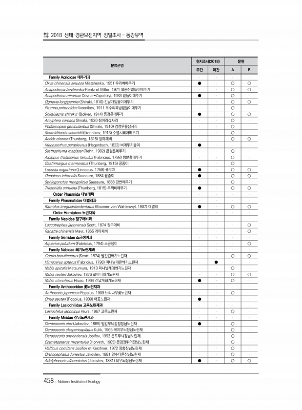2018 생태·경관보전지역 정밀조사 동강유역 458 ? National Institute of Ecology 분류군명 현지조사 2018 문헌 주간 야간 A B Family Acrididae 메뚜기과 Oxya chinensis sinuosa Mistshenko, 1951 우리벼메뚜기 ● ○ ○ Anapodisma beybienkoi Rentz et Miller, 1971 팔공산밑들이메뚜기 ○ ○ Anapodisma miramae Dovnar-Zapolskyi, 1933 밑들이메뚜기 ● ○ Ognevia longipennis Shiraki, 1910 긴날개밑들이메뚜기 ○ ○ Prumna primnoides Ikonnikov, 1911 우수리북방밑들이메뚜기 ○ Shirakiac...