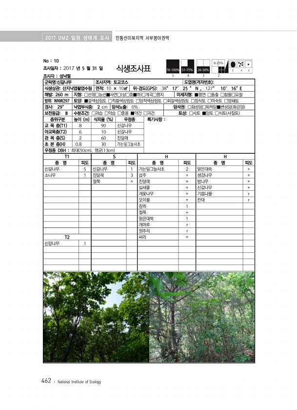 2017 DMZ 일원 생태계 조사 민통선이북지역 서부평야권역 462 ? National Institute of Ecology No 10 조사일자 2017 년 5 월 31 일 조사자 성낙필 식생조사표 군락명신갈나무 조사지역토교코스 도엽명 격자번호 식생상관산지낙엽활엽수림 면적10 × 10㎡ 위·경도 GPS 38° 17′ 25 ″ N , 127° 10′ 16″E 해발260 m 지형□산정□능선■사면□ 상□중■하 □계곡□평지 미세지형■평면 □돌출 □함몰□요철 방위WNW297 토양■갈색삼림토 □적황색삼림토 □암적색삼림토 □회갈색삼림토 □침식토 □미숙토 □암쇄토 경사29° 낙엽부식층2 cm 암석노출0% 암석권□화성암□퇴적암■변성암 화강암 보전등급Ⅲ 수분조건□과습 □약습 □중용 ■약건 □과건 토성□사토 ■양토 □식토 사질...