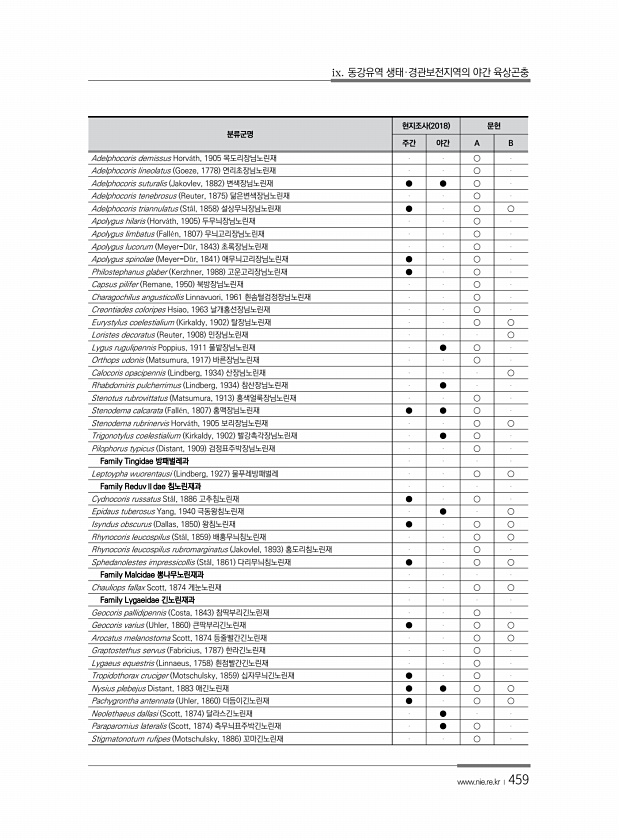 ix. 동강유역 생태·경관보전지역의 야간 육상곤충 www.nie.re.kr ?459 분류군명 현지조사 2018 문헌 주간 야간 A B Adelphocoris demissus Horv?th, 1905 목도리장님노린재 ○ Adelphocoris lineolatus Goeze, 1778 연리초장님노린재 ○ Adelphocoris suturalis Jakovlev, 1882 변색장님노린재 ● ● ○ Adelphocoris tenebrosus Reuter, 1875 닮은변색장님노린재 ○ Adelphocoris triannulatus St?l, 1858 설상무늬장님노린재 ● ○ ○ Apolygus hilaris Horv?th, 1905 두무늬장님노린재 ○ Apolygu...