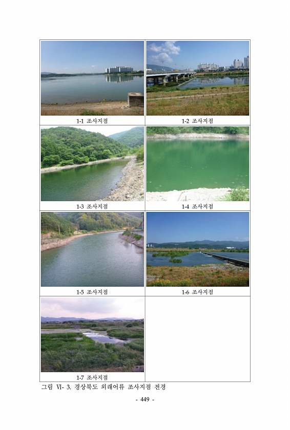 1-1 조사지점 1-2 조사지점 1-3 조사지점 1-4 조사지점 1-5 조사지점 1-6 조사지점 1-7 조사지점 그림 Ⅵ- 3. 경상북도 외래어류 조사지점 전경 449