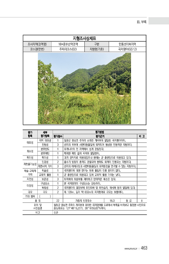 Ⅲ. 부록 www.nie.re.kr ? 463 지형조사상세표 조사지역 권역명 18-중부산악권역 구분 민통선이북지역 코스명 연번 주파리코스 02 지형명 기호 곡저평야 GS12 평가 항목 세부 평가항목 평가방법 평가점수 평가근거 비 고 대표성 지역 대표성 1 철원군 원남면 주파리 소하천 계곡부에 발달한 곡저평야이다. 전형성 3 산지의 곡부에 사면이동물질이 퇴적되어 형성된 전형적인 지형이다. 희소성 분포빈도 1 우리나라의 전 지역에서 쉽게 관찰된다. 분포패턴 1 특이한 패턴 없이 곡저에 발달한다. 특이성 특이성 1 과거 경작지로 이용되었으나 현재는 군 훈련장으로 이용되고 있다. 재현불가능성 민감성 2 홍수기 범람의 흔적도 관찰되어 현재도 퇴적이 진행되는 지형이다. 자연사적 가치 3 산지의 해체과정과 사면이동물질의...