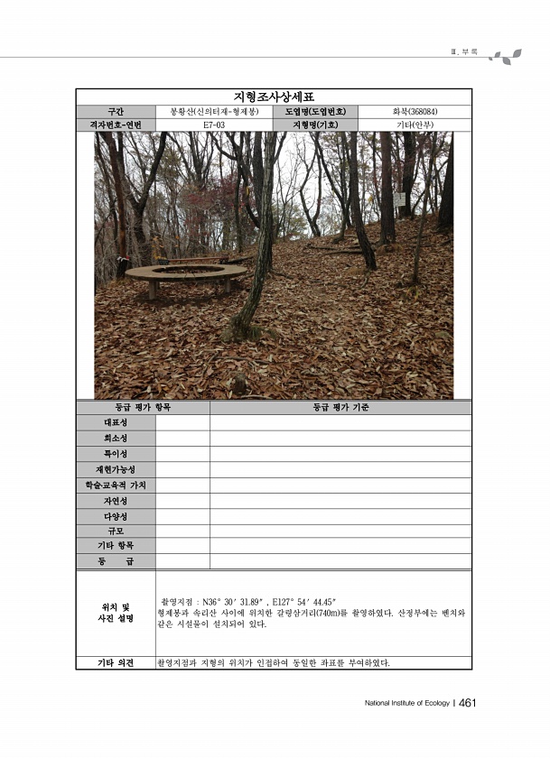 Ⅲ. 부 록 National Institute of EcologyⅠ461 지형조사상세표 구간 봉황산 신의터재-형제봉 도엽명 도엽번호 화북 368084 격자번호-연번 E7-03 지형명 기호 기타 안부 등급 평가 항목 등급 평가 기준 대표성 희소성 특이성 재현가능성 학술?교육적 가치 자연성 다양성 규모 기타 항목 등 급 위치 및 사진 설명 촬영지점 N36° 30′ 31.89″ , E127° 54′ 44.45″ 형제봉과 속리산 사이에 위치한 갈령삼거리 740m 를 촬영하였다. 산정부에는 벤치와 같은 시설물이 설치되어 있다. 기타 의견 촬영지점과 지형의 위치가 인접하여 동일한 좌표를부여하였다.