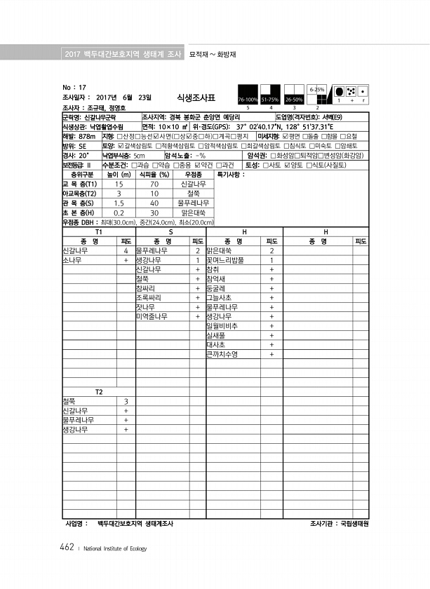2017 백두대간보호지역 생태계 조사 묘적재 화방재 462 ? National Institute of Ecology No 17 조사일자 2017년 6월 23일 조사자 조규태, 정영호 식생조사표 군락명신갈나무군락 조사지역경북 봉화군 춘양면 예당리 도엽명 격자번호 서벽 E9 식생상관낙엽활엽수림 면적10×10 ㎡ 위·경도 GPS 37°0240.17N, 128°5137.31E 해발878m 지형□산정□능선?사면 □상?중□하 □계곡□평지 미세지형?평면 □돌출 □함몰 □요철 방위SE 토양?갈색삼림토 □적황색삼림토 □암적색삼림토 □회갈색삼림토 □침식토 □미숙토 □암쇄토 경사20° 낙엽부식층5cm 암석노출-% 암석권□화성암□퇴적암□변성암 화강암 보전등급Ⅱ 수분조건□과습 □약습 □중용 ?약건 □과건 토성□사토 ?양토 □식토 ...