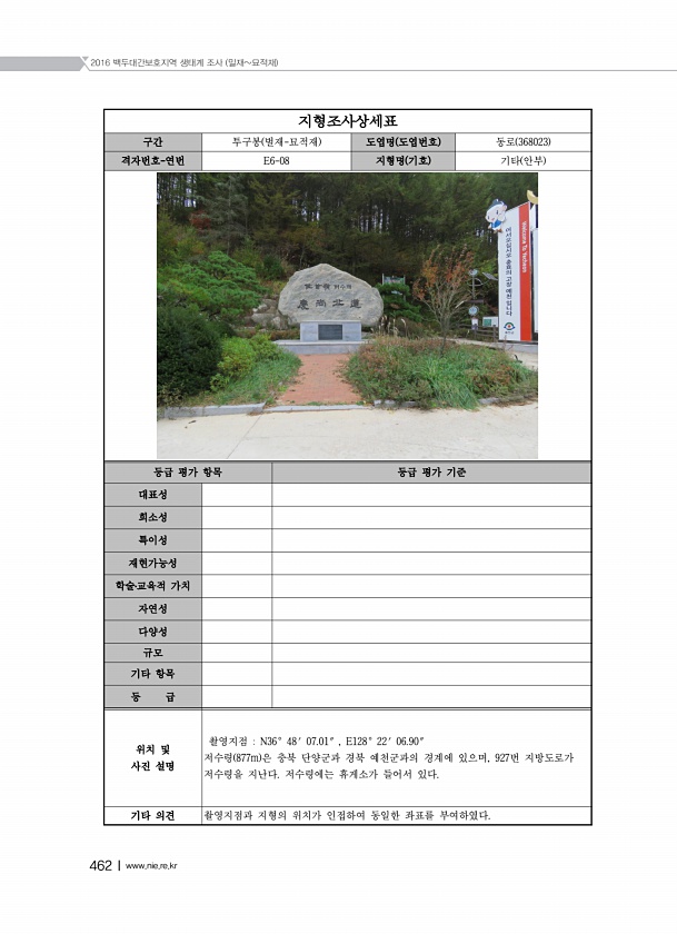 2016 백두대간보호지역 생태계 조사 밀재묘적재 462Ⅰwww.nie.re.kr 지형조사상세표 구간 투구봉 벌재-묘적재 도엽명 도엽번호 동로 368023 격자번호-연번 E6-08 지형명 기호 기타 안부 등급 평가 항목 등급 평가 기준 대표성 희소성 특이성 재현가능성 학술?교육적 가치 자연성 다양성 규모 기타 항목 등 급 위치 및 사진 설명 촬영지점 N36° 48′ 07.01″ , E128° 22′ 06.90″ 저수령 877m 은 충북 단양군과 경북 예천군과의 경계에 있으며, 927번 지방도로가 저수령을 지난다. 저수령에는 휴게소가 들어서 있다. 기타 의견 촬영지점과 지형의 위치가 인접하여 동일한 좌표를부여하였다.
