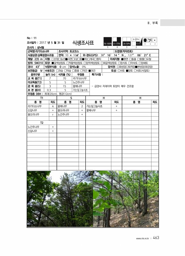 Ⅲ. 부록 www.nie.re.kr ? 463 No 11 조사일자 2017 년 5 월 31 일 조사자 성낙필 식생조사표 군락명리기다소나무 조사지역토교코스 도엽명 격자번호 식생상관상록침엽수조림 면적10 × 10㎡ 위·경도 GPS 38° 16′ 14 ″ N , 127° 06′ 21″E 해발235 m 지형□산정□능선■사면□ 상□중■하 □계곡□평지 미세지형■평면 □돌출 □함몰□요철 방위SW210 토양■갈색삼림토 □적황색삼림토 □암적색삼림토 □회갈색삼림토 □침식토 □미숙토 □암쇄토 경사43° 낙엽부식층0 cm 암석노출0% 암석권□화성암□퇴적암■변성암 화강암 보전등급Ⅳ 수분조건□과습 □약습 □중용 □약건 ■과건 토성□사토 ■양토 □식토 사질토 층위구분 높이 m 식피율 % 우점종 특기사항 교 목 층 T1 7 70 리기다...