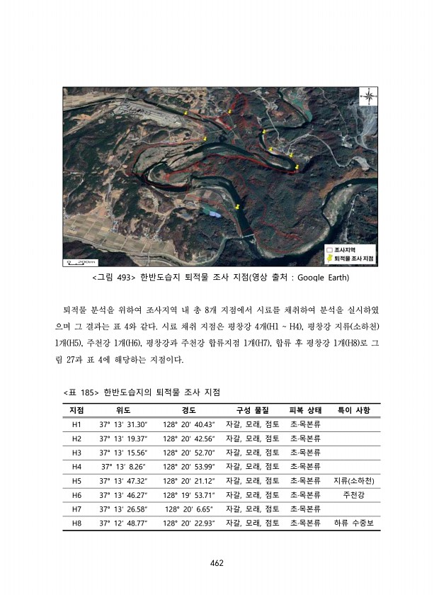 462 그림 493 한반도습지 퇴적물 조사 지점 영상 출처 Google Earth 퇴적물 분석을 위하여 조사지역 내 총 8개 지점에서 시료를 채취하여 분석을 실시하였 으며 그 결과는 표 4와 같다. 시료 채취 지점은 평창강 4개 H1 H4 , 평창강 지류 소하천 1개 H5 , 주천강 1개 H6 , 평창강과 주천강 합류지점 1개 H7 , 합류 후 평창강 1개 H8 로 그 림 27과 표 4에 해당하는 지점이다. 지점 위도 경도 구성 물질 피복 상태 특이 사항 H1 37° 13′ 31.30″ 128° 20′ 40.43″ 자갈, 모래, 점토 초·목본류 H2 37° 13′ 19.37″ 128° 20′ 42.56″ 자갈, 모래, 점토 초·목본류 H3 37° 13′ 15.56″ 128° 20′ 52.70″ 자갈, 모래,...