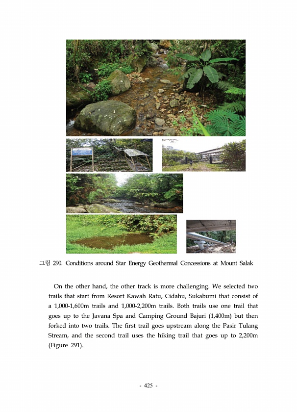 425 그림 290. Conditions around Star Energy Geothermal Concessions at Mount Salak On the other hand, the other track is more challenging. We selected two trails that start from Resort Kawah Ratu, Cidahu, Sukabumi that consist of a 1,000-1,600m trails and 1,000-2,200m trails. Both trails use one trail that goes up to the Javana Spa and Camping Ground Bajuri 1,400m but then forked into two trails. The...