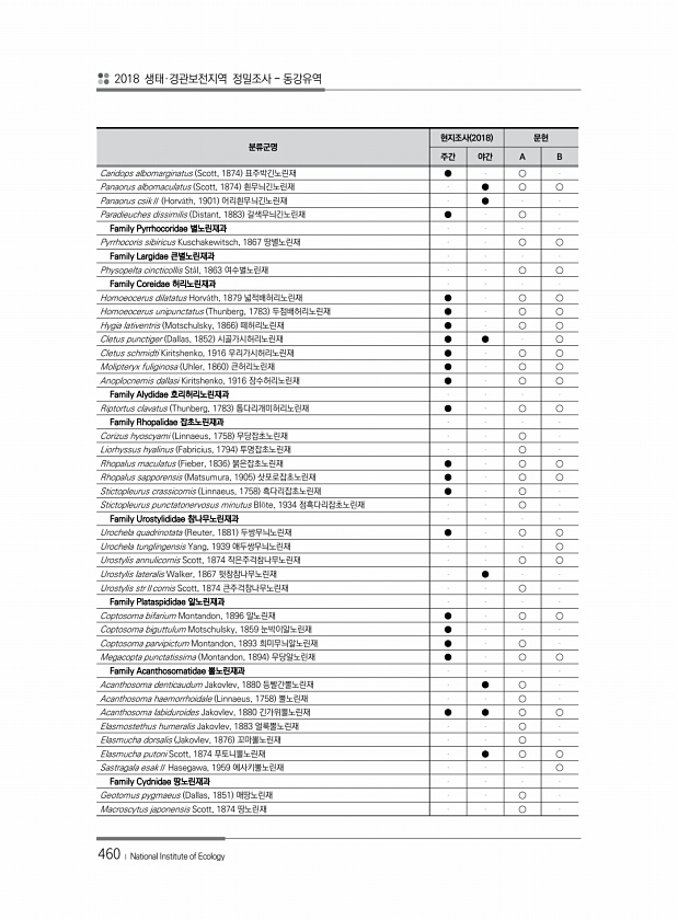 2018 생태·경관보전지역 정밀조사 동강유역 460 ? National Institute of Ecology 분류군명 현지조사 2018 문헌 주간 야간 A B Caridops albomarginatus Scott, 1874 표주박긴노린재 ● ○ Panaorus albomaculatus Scott, 1874 흰무늬긴노린재 ● ○ ○ Panaorus csikⅡ Horv?th, 1901 어리흰무늬긴노린재 ● Paradieuches dissimilis Distant, 1883 갈색무늬긴노린재 ● ○ Family Pyrrhocoridae 별노린재과 Pyrrhocoris sibiricus Kuschakewitsch, 1867 땅별노린재 ○ ○ Family Largidae 큰별노린재과...