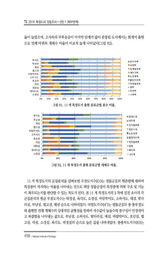 2018 특정도서 정밀조사 신안 1 북부권역 458 ? National Institute of Ecology 율이 높았으며, 고사목의 부후등급이 마지막 단계가 많이 관찰된 도서에서는 흰개미 출현 으로 인해 바퀴목 개체수 비율이 비교적 높게 나타났다 그림 92 0% 10% 20% 30% 40% 50% 60% 70% 80% 90% 100% 소정섬 밖다리섬 대정섬 대섬 호감섬 소허사도 바람막이도 법고섬 매섬 부남섬 육각도 잠자리목 바퀴목 집게벌레목 메뚜기목 노린재목 풀잠자리목 딱정벌레목 벌목 파리목 나비목 그림 91. 11 개 특정도서 출현 분류군별 종수 비율. 0% 20% 40% 60% 80% 100% 소정섬 밖다리섬 대정섬 대섬 호감섬 소허사도 바람막이도 법고섬 매섬 부남섬 육각도 잠자리목 바퀴목 집게벌레목 ...