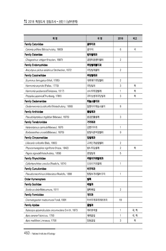 2018 특정도서 정밀조사 신안 1 남부권역 460 ? National Institute of Ecology 학 명 국 명 2018 비고 Family Cetoniidae 꽃무지과 Cetonia pilifera Motschulsky, 1860 꽃무지 6 국 Family Elateridae 방아벌레과 Chiagosinus vittiger Heyden, 1887 검정테광방아벌레 2 Family Endomychidae 무당벌레붙이과 Ancylopus pictus asiaticus Strohecker, 1972 무당벌레붙이 2 Family Coccinellidae 무당벌레과 Scymnus ferrugatus Moll, 1785 대륙애기무당벌레 2 Harmonia axyridis Pallas, 1773 무당벌레 3 특...