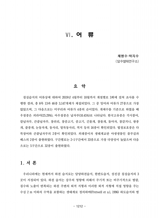 1212 Ⅵ. 어 류 채병수·박지수 담수생태연구소 요 약 침실습지의 어류상에 대하여 2019년 4월부터 10월까지 계절별로 3회에 걸쳐 조사를 수 행한 결과, 총 8목 13과 46종 3,147개체가 채집되었다. 그 중 잉어과 어류가 27종으로 가장 많았으며, 그 다음으로는 미꾸리과 어류가 4종의 순이었다. 개체수를 기준으로 하였을 때 우점종은 피라미 25.29% , 아우점종은 납자루 10.45% 로 나타났다. 한국고유종은 각시붕어, 칼납자루, 큰줄납자루, 참쉬리, 참중고기, 중고기, 긴몰개, 참몰개, 돌마자, 참갈겨니, 왕종 개, 줄종개, 눈동자개, 동사리, 얼룩동사리, 꺽지 등의 16종이 확인되었다. 법정보호종은 다 묵장어와 큰줄납자루의 2종이 확인되었다. 외래종이자 생태계교란 야생생물인 블루길과 배스의 ...